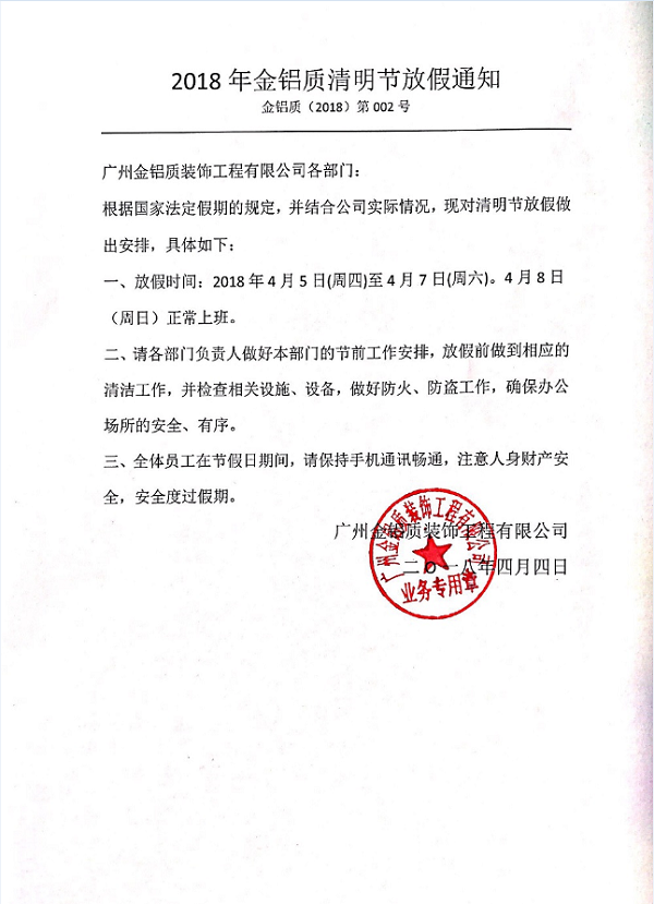 2018年金鋁質(zhì)清明節(jié)放假通知