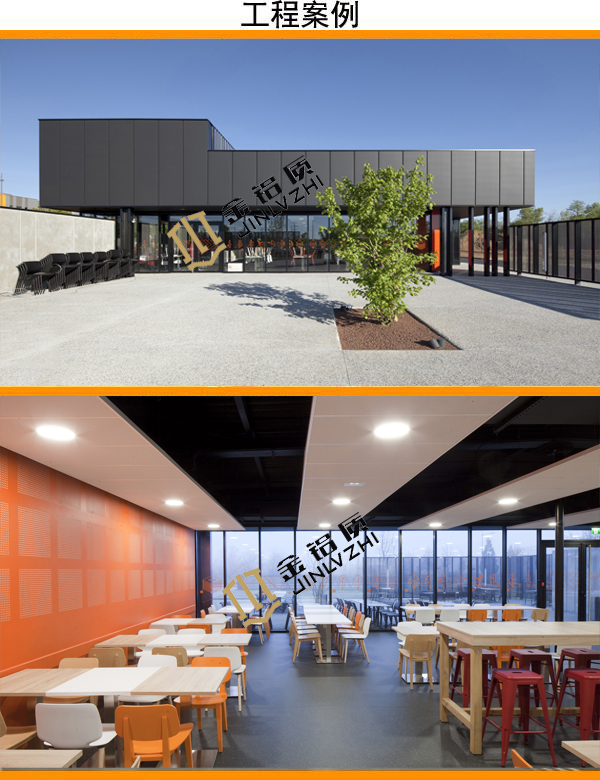無論從哪個角度看,都是相當(dāng)時尚美觀的。如果你的餐廳也想裝成這樣的效果,可以選擇金鋁質(zhì)的鋁單板,可根據(jù)客戶的實際需求,加工定制成你所需要的形狀,圖案,銷售安裝一體化管理,讓你的餐廳也一樣煥然一新,讓生意變得更加興旺。